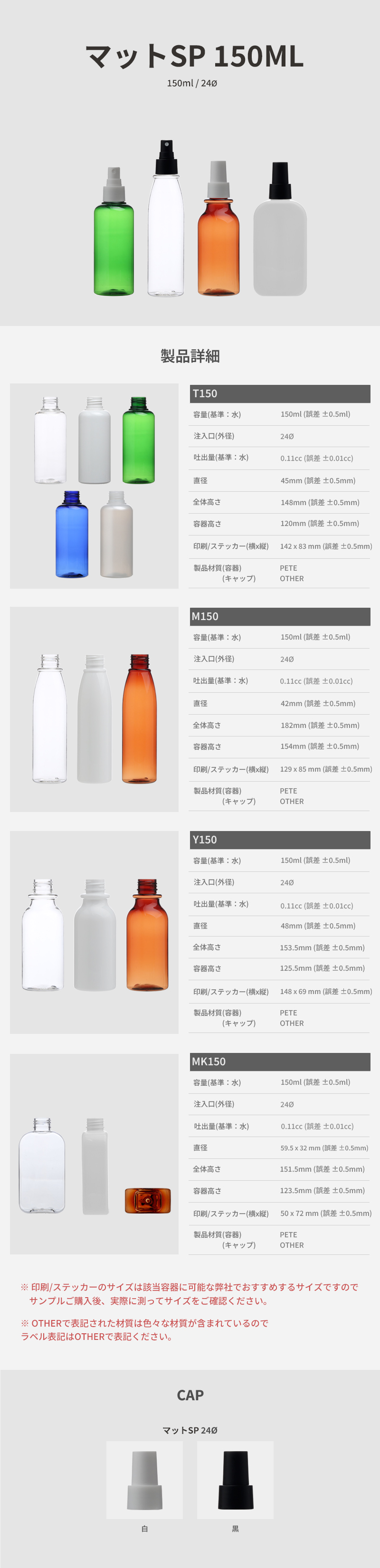 | ボトルの色を選ぶ | T150_透明(ロット:100個), T150_白(ロット:100個), T150_青(ロット:100個), T150_緑(ロット:100個), T150_シルバー(ロット:100個), T150_黒(ロット:100個), M150_透明(ロット:100個), M150_白(ロット:100個), M150_栗(ロット:100個), Y150_透明(ロット:100個), Y150_白(ロット:100個), Y150_栗(ロット:100個), MK150_透明(ロット:100個), MK150_白(ロット:100個), MK150_栗(ロット:100個) |