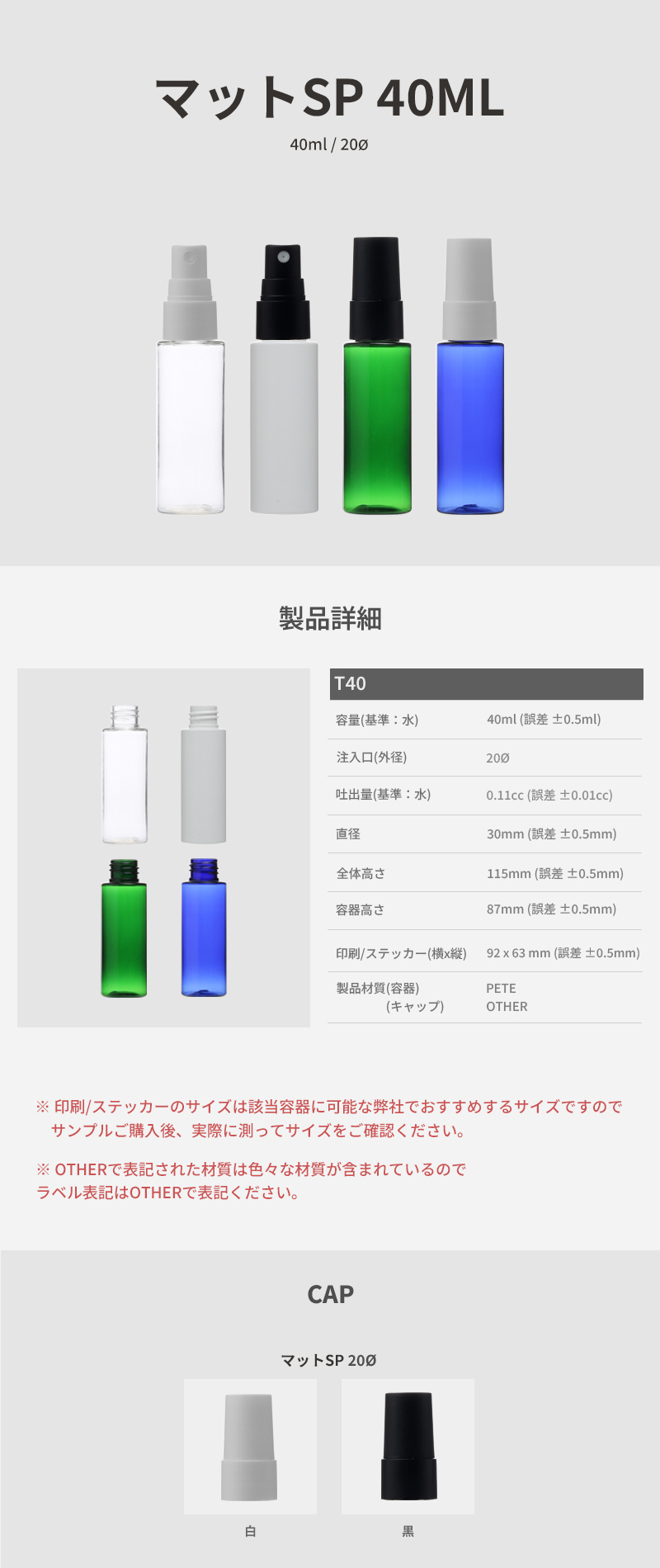 前の商品 次の商品 ボトル「化粧品容器」マットスプレー 40ml (20Ø) ボトル_ロット100個 ¥13,500 ボトル「化粧品容器」マットスプレー 40ml (20Ø) ボトル_ロット100個 商品名: マットスプレー 40ml (20Ø) ボトル 容量(ミリリットル): 40ml ボトルの色を選ぶ 選択してくださいT40_透明(ロット:100個)T40_白(ロット:100個)T40_青(ロット:100個)T40_緑(ロット:100個) キャップの色を選ぶ 選択してください透明白黒クリア ボトル「化粧品容器」マットスプレー 40ml (20Ø) ボトル_ロット100個個 お買い物カゴに追加 商品コード: 該当なし カテゴリー: 消毒剤容器, スプレー15ml~110ml, 化粧品容器, フィンガースプレー, PET 説明 追加情報 レビュー (0) 説明 ボトル「化粧品容器」マットスプレー 40ml (20Ø) ボトル_ロット100個 追加情報 重さ 1 g ボトルの色を選ぶ T40_透明(ロット:100個), T40_白(ロット:100個), T40_青(ロット:100個), T40_緑(ロット:100個) キャップの色を選ぶ 透明, 白, 黒 レビュー レビューはまだありません。 “ボトル「化粧品容器」マットスプレー 40ml (20Ø) ボトル_ロット100個” の口コミを投稿します コメントをキャンセルメールアドレスが公開されることはありません。 ※ が付いている欄は必須項目ですレビュー *名前 * メール * 次回のコメントで使用するためブラウザーに自分の名前、メールアドレス、サイトを保存する。 関連商品 クイックビュー クイックビュー 化粧品容器, ネジキャップ, 基本形ボトル「化粧品容器」ネジキャップ E200ml (100個) ¥12,000 オプションを選択 この商品には複数のバリエーションがあります。 オプションは商品ページから選択できます クイックビュー クイックビュー 化粧品容器, ネジキャップ, AL(アルミニウム)ボトル「化粧品容器」アルミネジキャップ E1000/28 (68個) ¥24,000 オプションを選択 この商品には複数のバリエーションがあります。 オプションは商品ページから選択できます クイックビュー クイックビュー 化粧品容器, ネジキャップ, AL(アルミニウム)ボトル「化粧品容器」アルミネジキャップ E250R (100個) ¥20,000 オプションを選択 この商品には複数のバリエーションがあります。 オプションは商品ページから選択できます