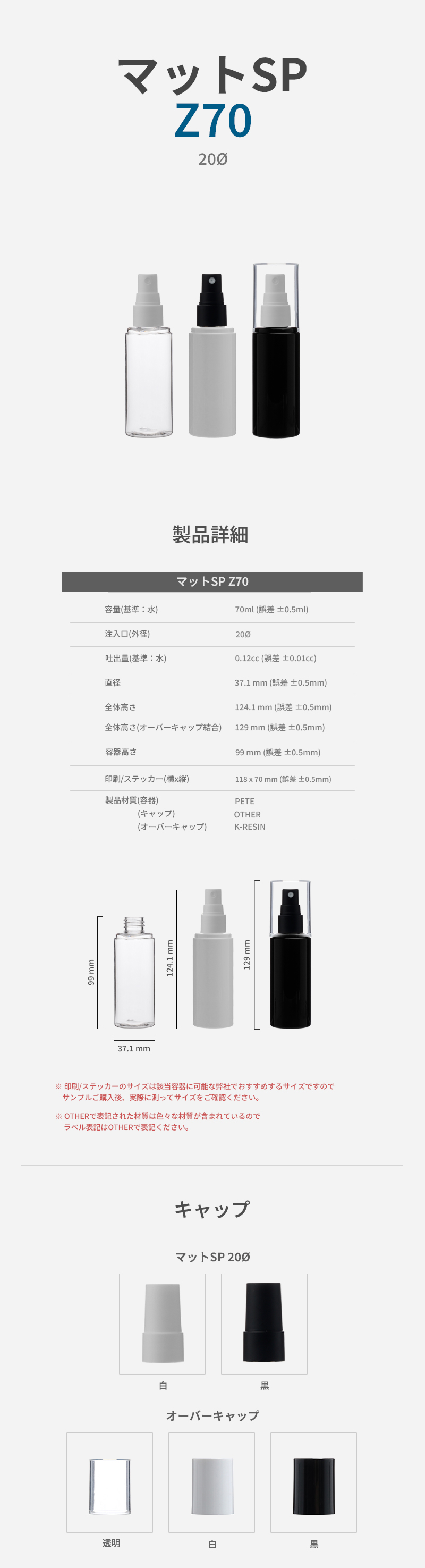 前の商品 次の商品 ボトル「化粧品容器」マットSP Z70 (100個) ¥23,800 ボトル「化粧品容器」マットSP Z70 (100個) 商品名: マットSP Z70 容量(ミリリットル): 70ml エッセンスポンプの透明のキャップを外してオーバーキャップをつけてください。 容器の色を選択 選択してください白黒透明 スプレーの色を選択 選択してください透明白黒 オーバーキャップ色を選択 選択してください白黒透明クリア ボトル「化粧品容器」マットSP Z70 (100個)個 お買い物カゴに追加 商品コード: 該当なし カテゴリー: 化粧品容器, フィンガースプレー, PET 説明 追加情報 レビュー (0) 説明 ボトル「化粧品容器」マットSP Z70 (100個) 追加情報 重さ 1 g 容器の色を選択 白, 黒, 透明 スプレーの色を選択 透明, 白, 黒 オーバーキャップ色を選択 白, 黒, 透明 レビュー レビューはまだありません。 “ボトル「化粧品容器」マットSP Z70 (100個)” の口コミを投稿します コメントをキャンセルメールアドレスが公開されることはありません。 ※ が付いている欄は必須項目ですレビュー *名前 * メール * 次回のコメントで使用するためブラウザーに自分の名前、メールアドレス、サイトを保存する。 関連商品 クイックビュー クイックビュー 化粧品容器, ネジキャップ, 基本形ボトル「化粧品容器」ネジキャップ E50ml (200個) ¥16,000 オプションを選択 この商品には複数のバリエーションがあります。 オプションは商品ページから選択できます クイックビュー クイックビュー 化粧品容器, ネジキャップ, AL(アルミニウム)ボトル「化粧品容器」アルミネジキャップ E200ml (100個) ¥18,000 オプションを選択 この商品には複数のバリエーションがあります。 オプションは商品ページから選択できます クイックビュー クイックビュー 化粧品容器, ネジキャップ, 基本形ボトル「化粧品容器」ネジキャップ E150ml (200個) ¥16,000 オプションを選択 この商品には複数のバリエーションがあります。 オプションは商品ページから選択できます