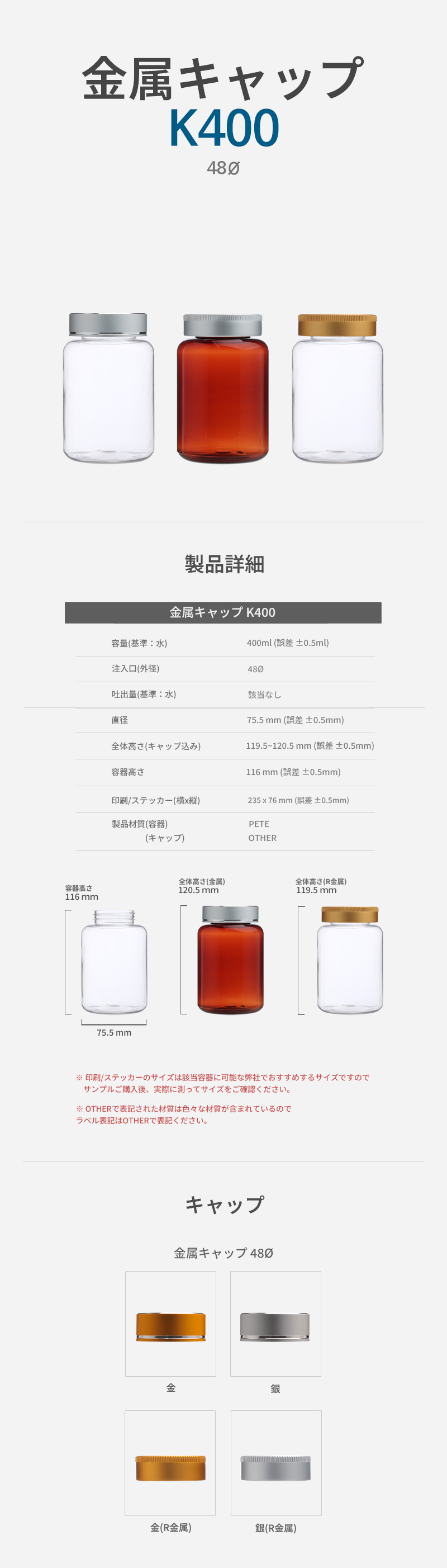 ボトル「多用途容器」金属キャップ K400ml (180個)