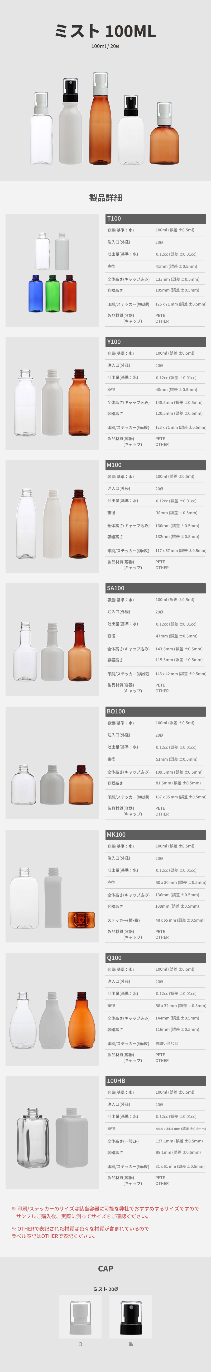 | ボトルの色を選ぶ | T100_透明(ロット:100個), T100_白(ロット:100個), T100_青(ロット:100個), T100_緑(ロット:100個), T100_栗(ロット:100個), BO100_透明(ロット:100個), BO100_白(ロット:100個), BO100_栗(ロット:100個), M100_透明(ロット:100個), M100_白(ロット:100個), M100_栗(ロット:100個), SA100_透明(ロット:100個), SA100_白(ロット:100個), SA100_栗(ロット:100個), Y100_透明(ロット:100個), Y100_白(ロット:10個), Y100_栗(ロット:100個), Q100_透明(ロット:100個), Q100_白(ロット:100個), Q100_栗(ロット:100個), MK100_透明(ロット:100個), MK100_白(ロット:100個), MK100_栗(ロット:100個), 100HB_透明(ロット:100個), 100HB_白(ロット:100個) |