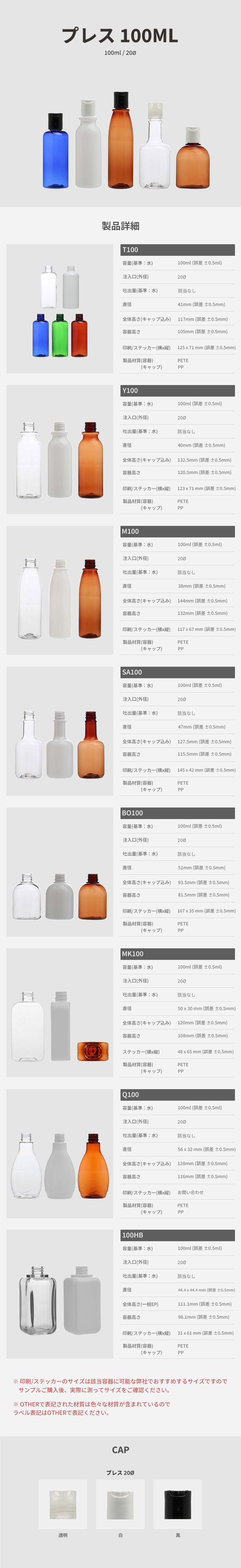 | ボトルの色を選ぶ | T100_透明(ロット:200個), T100_白(ロット:200個), T100_青(ロット:200個), T100_緑(ロット:200個), T100_栗(ロット:200個), BO100_透明(ロット:200個), BO100_白(ロット:200個), BO100_栗(ロット:200個), M100_透明(ロット:200個), M100_白(ロット:200個), M100_栗(ロット:200個), SA100_透明(ロット:200個), SA100_白(ロット:200個), SA100_栗(ロット:200個), Y100_透明(ロット:200個), Y100_白(ロット:200個), Y100_栗(ロット:200個), Q100_透明(ロット:200個), Q100_白(ロット:200個), Q100_栗(ロット:200個), MK100_透明(ロット:200個), MK100_白(ロット:200個), MK100_栗(ロット:200個), 100HB_透明(ロット:100個), 100HB_白(ロット:100個) |
