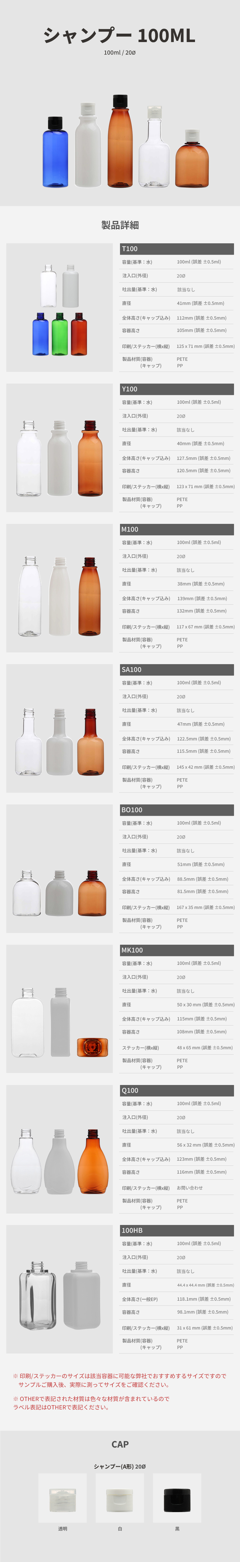 | ボトルの色を選ぶ | T100_透明(ロット:200個), T100_白(ロット:200個), T100_青(ロット:200個), T100_緑(ロット:200個), T100_栗(ロット:200個), BO100_透明(ロット:200個), BO100_白(ロット:200個), BO100_栗(ロット:200個), M100_透明(ロット:200個), M100_白(ロット:200個), M100_栗(ロット:200個), SA100_透明(ロット:200個), SA100_白(ロット:200個), SA100_栗(ロット:200個), Y100_透明(ロット:200個), Y100_白(ロット:200個), Y100_栗(ロット:200個), Q100_透明(ロット:200個), Q100_白(ロット:200個), Q100_栗(ロット:200個), MK100_透明(ロット:200個), MK100_白(ロット:200個), MK100_栗(ロット:200個), 100HB_透明(ロット:100個), 100HB_白(ロット:100個) |